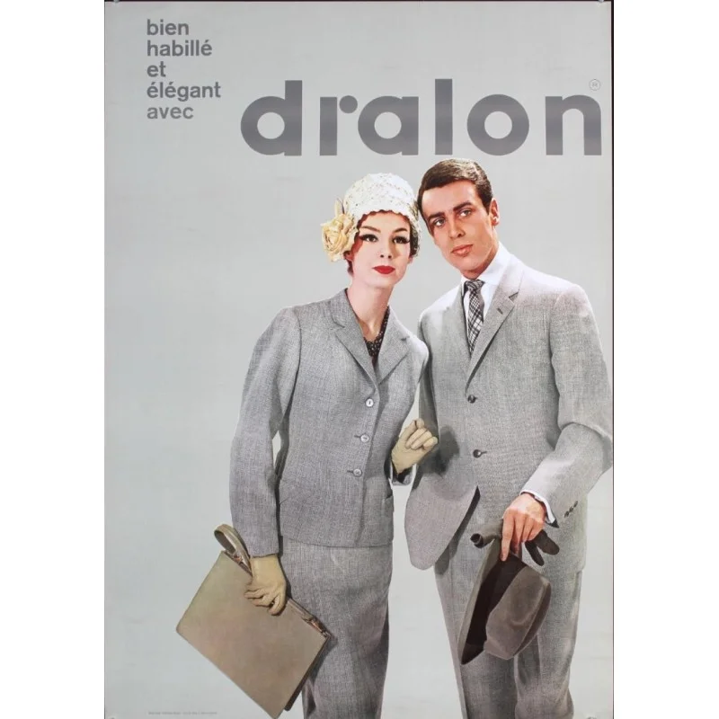 Large vintage 1961 Swiss poster advertising the Dralon clothing brand. Due to its large size, the poster can only be shipped via Priority Mail