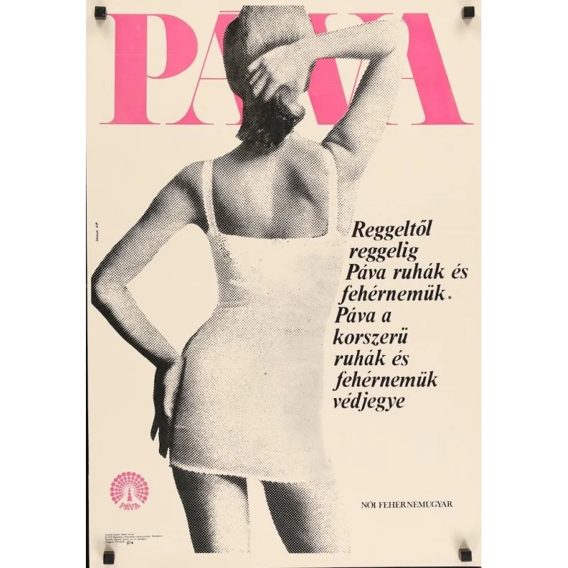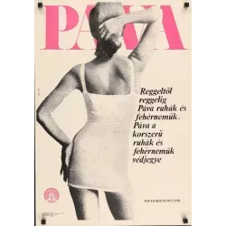 Superb vintage Hungarian advertising poster printed for the 1969 campaign of the feminine underwear brand Pava (translated as Peacock)