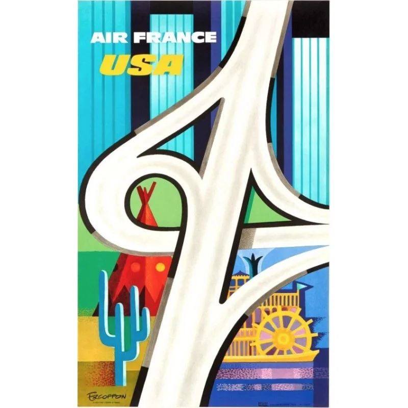 Very rare vintage 1963 Air France poster designed by Excoffon advertising flighst to the USA