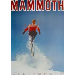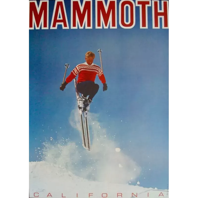 Original 1967 travel poster advertising skiing at Mammoth resort in California with an incredible colorful image of skier Cory Fleming jumping in snow. Part of the Loo Art poster series