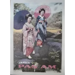 Ultra rare vintage mid 60's PanAmerican Airways travel poster advertising flights to Japan with several geishas. Poster is linen backed. Due to its heavier weight the poster can only be shipped Priority. Higher costs than usual apply. Please contact the Gallery