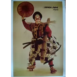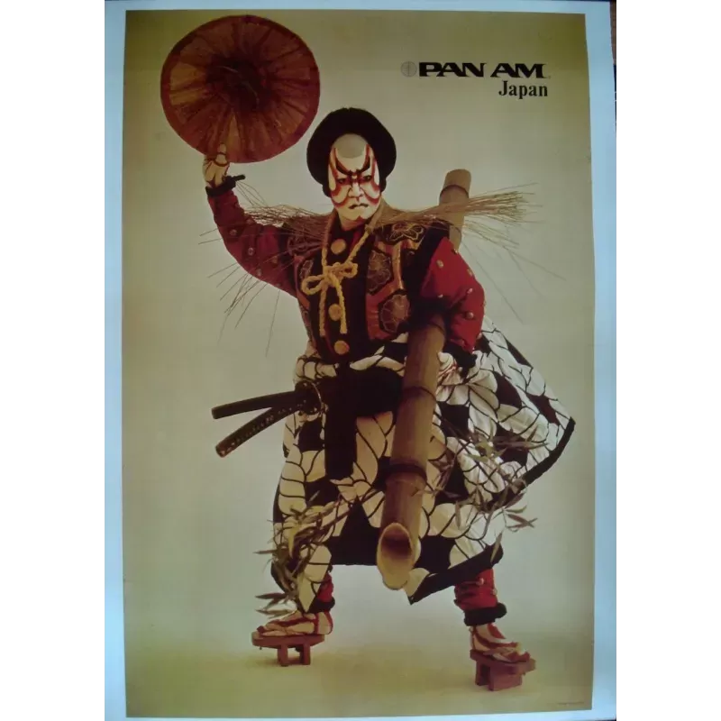 Vintage 1978 Pan Am poster advertising flights to Japan with a kabuki theater actor. Poster is linen backed