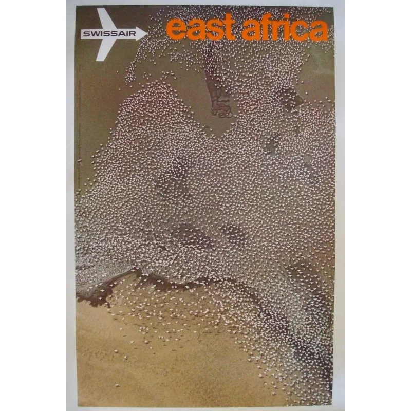 Very rare vintage 1971 Swissair travel poster part of the airview series designed by Emil Schulthess advertising flights to East Africa with an aerial view of Lake Hanigan in Kenya. Poster is linen backed
