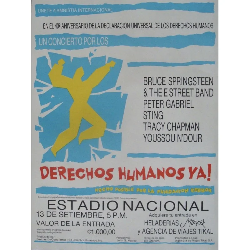 Vintage concert poster for Amnesty international 1988 San Jose concert poster featuring Bruce Springsteen, Sting, Peter Gabriel and Tracy Chapman