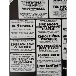 Ultra rare original Bill Graham Productions menu style poster advertising the 1977 San Francisco Bay area concerts featuring Led Zeppelin, Kiss, The Ramones. Design by Randy Tuten