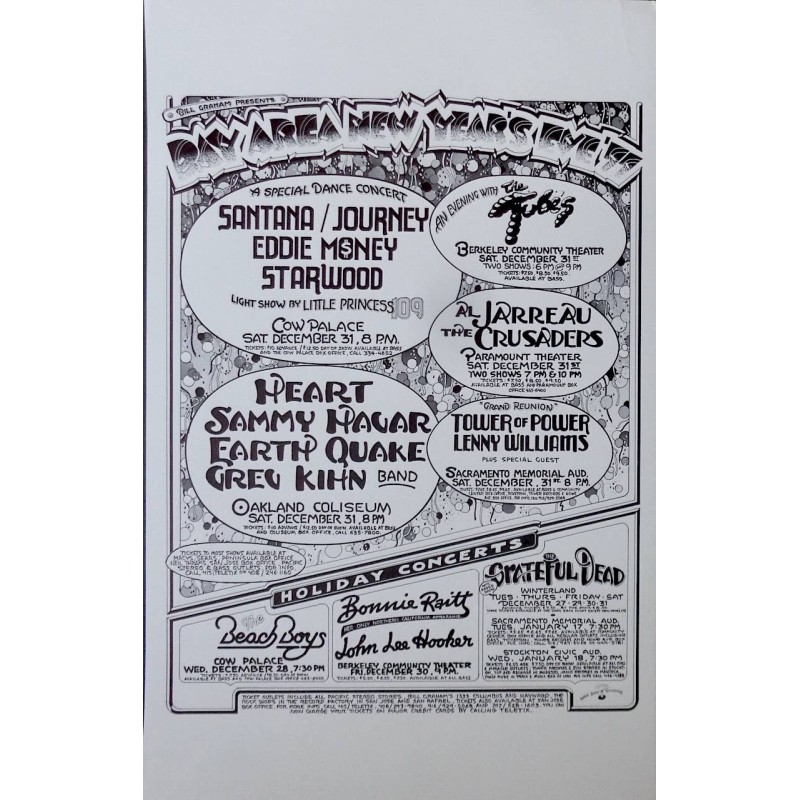 Ultra rare original Bill Graham Productions menu style poster designed by Randy Tuten advertising the 1977 New Year's Eve San Francisco Bay area concerts featuring The Grateful Dead, The Beach Boys, Santana, Heart and Journey