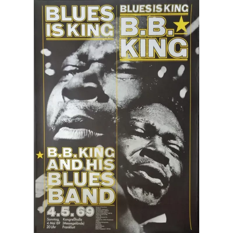 Very rare original German concert poster for B.B. King's 1969 Frankfurt show. Design by Gunther Kieser