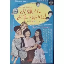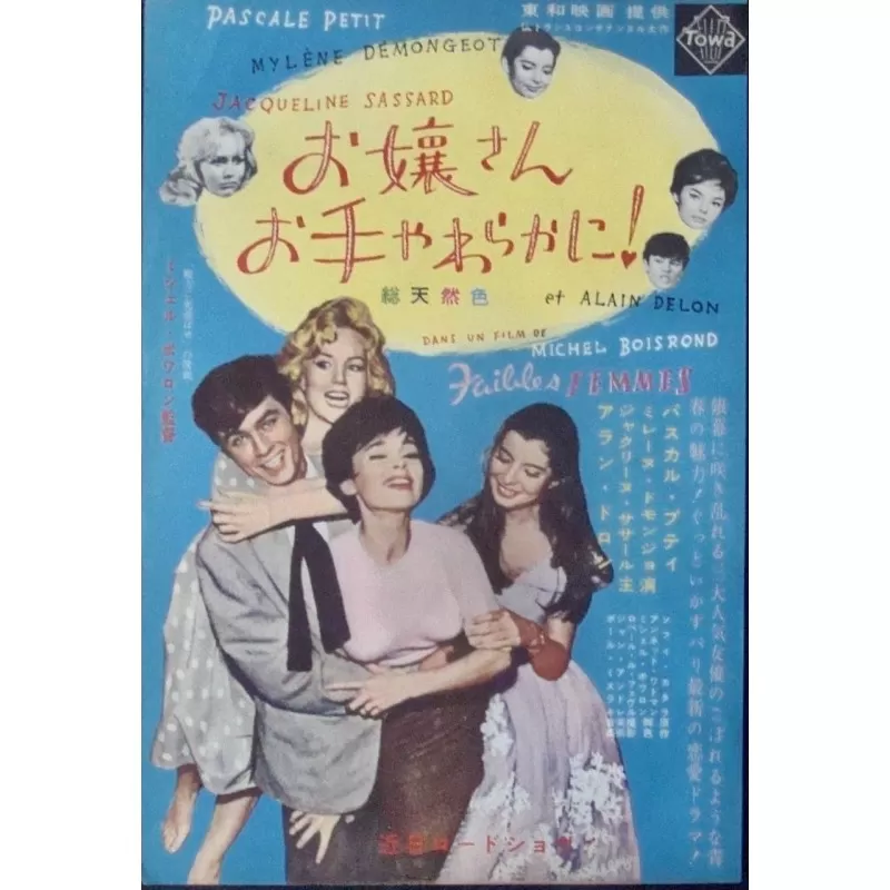 Rare vintage double sided Japanese Ad poster for Alain Delon and Mylene Demongeot's 1959 comedy. Verso is an ad for Charlton Heston and Yul Brunner's The Buccaneer
