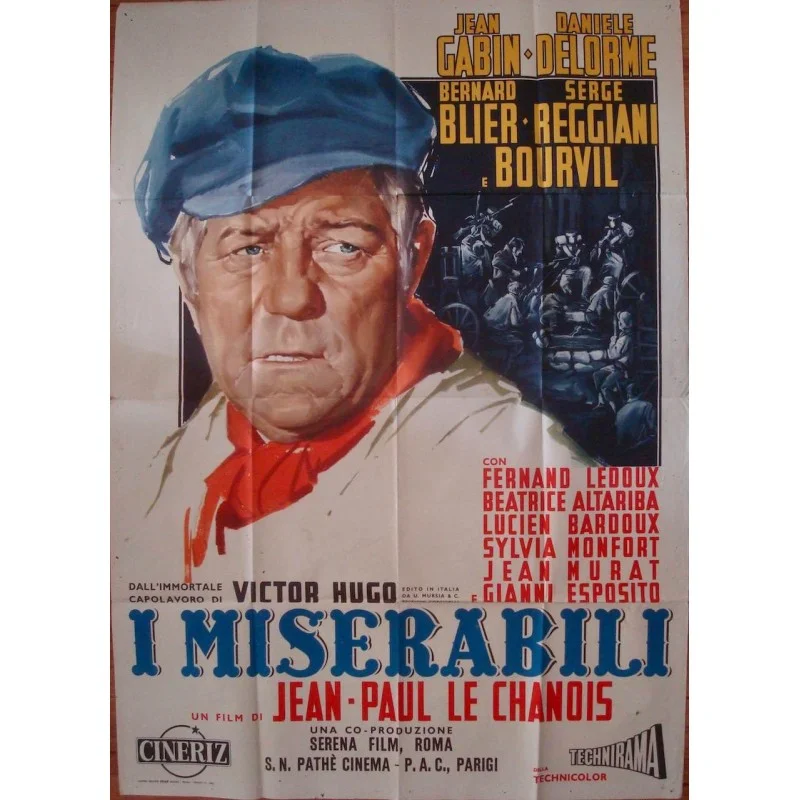 Very rare Italian poster with a splendid portrait of Jean Gabin in the 1958 French adaptation of Victor Hugo's masterpiece