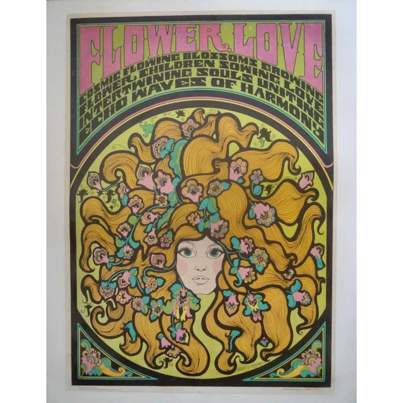 Beautiful vintage 1967 British psychedelic poster with Art Nouveau style Art by Keelan. Poster is linen backed