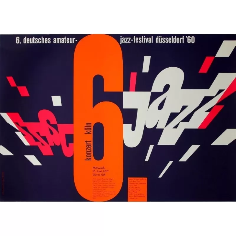 Vintage concert poster with colorful design by Wolf Dieter Zimmermann for the 1960 edition of the Dusseldorf Deutsches Jazz Amateur