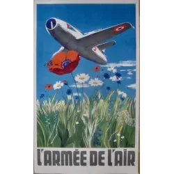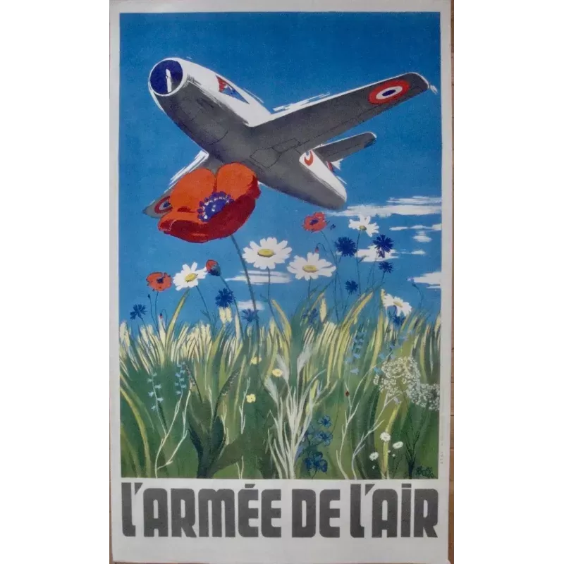 Very rare vintage 1956 French miltary Propaganda poster featuriung a French Air Force jet flying over a field of flowers