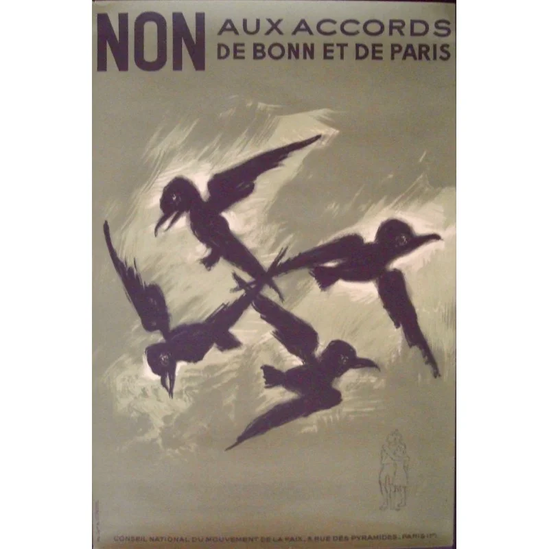 Rare vintage 1954 French Politics poster against the Franco-German 1954 accords with a striking ravens / swastika like design