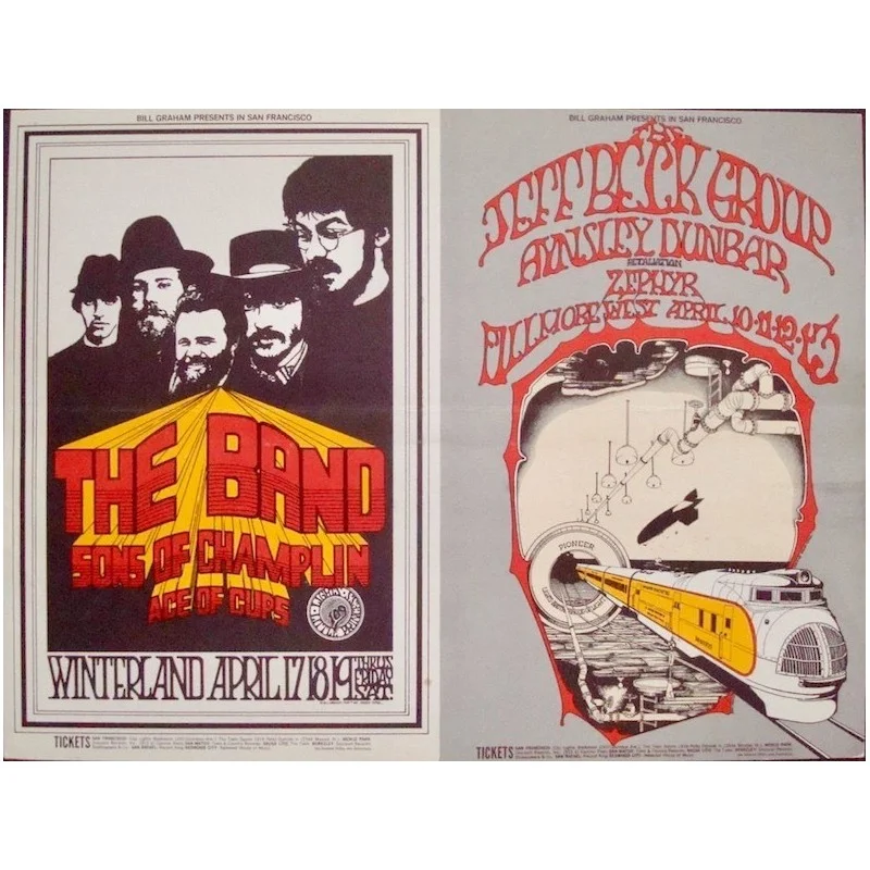 Vintage double-sided large postcard for the 1969 Fillmore West and Winterland concerts featuring The Band and Jeff Beck
