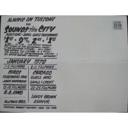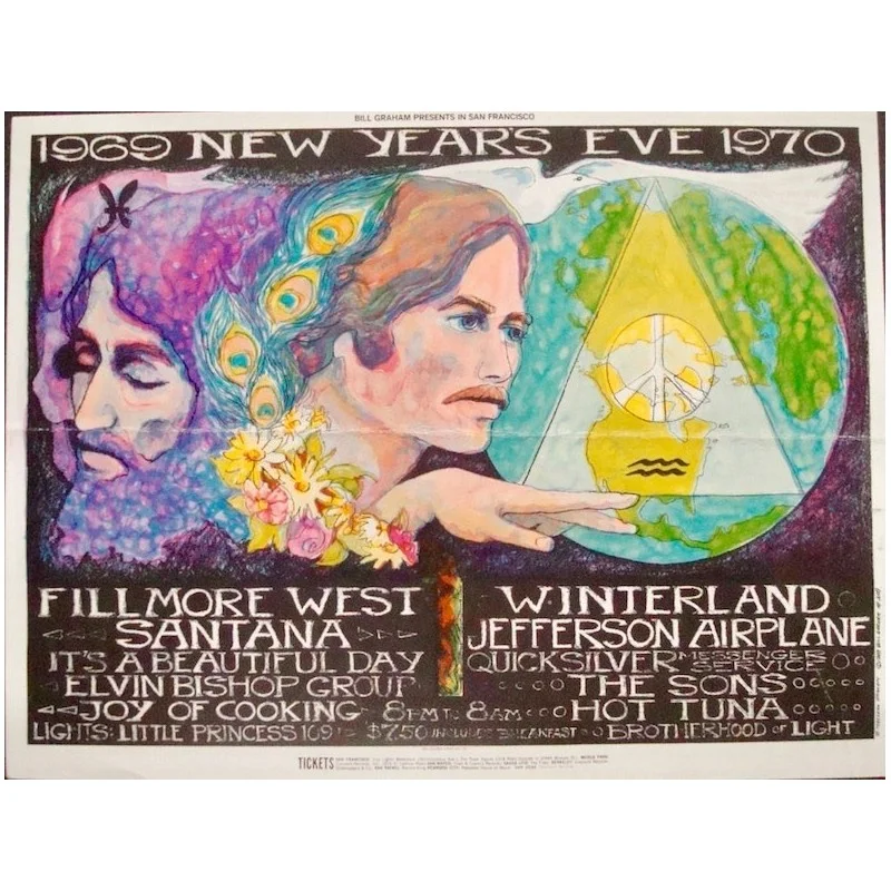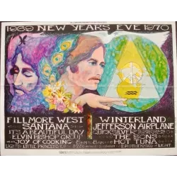 Vintage double-sided large postcard for the 1970 Fillmore West and Winterland New Year's Eve concerts featuring Santana, Jefferson Airplane and Hot Tuna