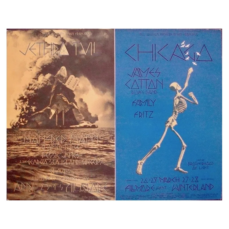 Vintage double-sided large postcard for the 1970 Fillmore West concerts featuring Chicago and Jethro Tull