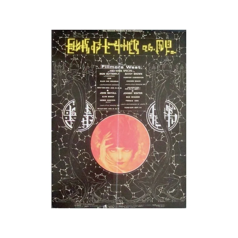 Vintage double-sided large postcard for the 1970 Fillmore West and Winterland concerts featuring Iron Butterfly, John Mayall and Herbie Hancock