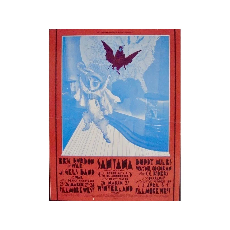 Vintage double-sided large postcard for the 1971 Fillmore West and Winterland concerts featuring Santana and Eric Burdon