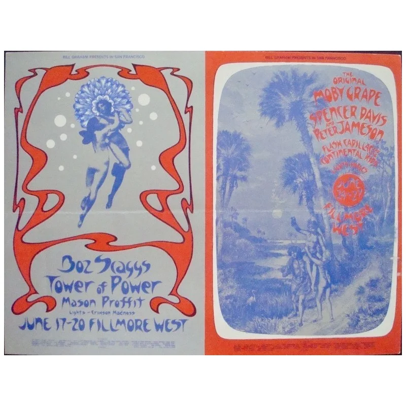 Vintage double-sided large postcard for the 1971 Fillmore West concerts featuring Boz Scaggs and Moby Grape