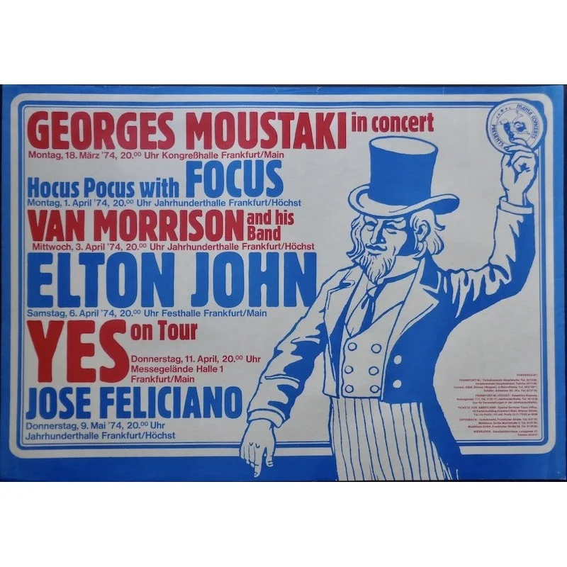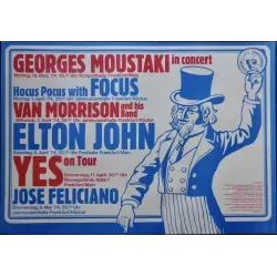 Ultra rare original German concert poster for Elton John, Van Morrison, Yes, Jose Feliciano, Focus and George Moustaki's German Tours
