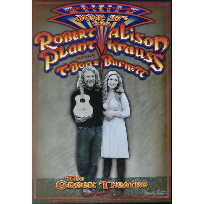Rare colorful original concert poster hand signed by Randy Tuten for Robert Plant and Alison Krauss' 2008 Berkeley show