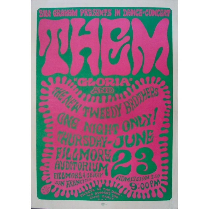 Ultra rare first print concert poster (with union logo stamp) designed by Wes Wison for Them / Van Morrison's 1966 Fillmore West show