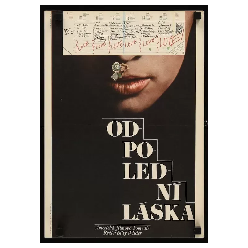 Small Czech poster designed in 1972 by Ziegler for the first release of the Billy Wilder directed romantic movie starring Audrey Hepburn and Gary Cooper