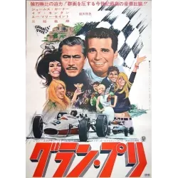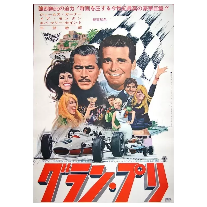 Vintage Japanese poster for one of the best Formula 1 movies starring James Garner, Yves Montand, Toshiro Mifune and Francoise Hardy