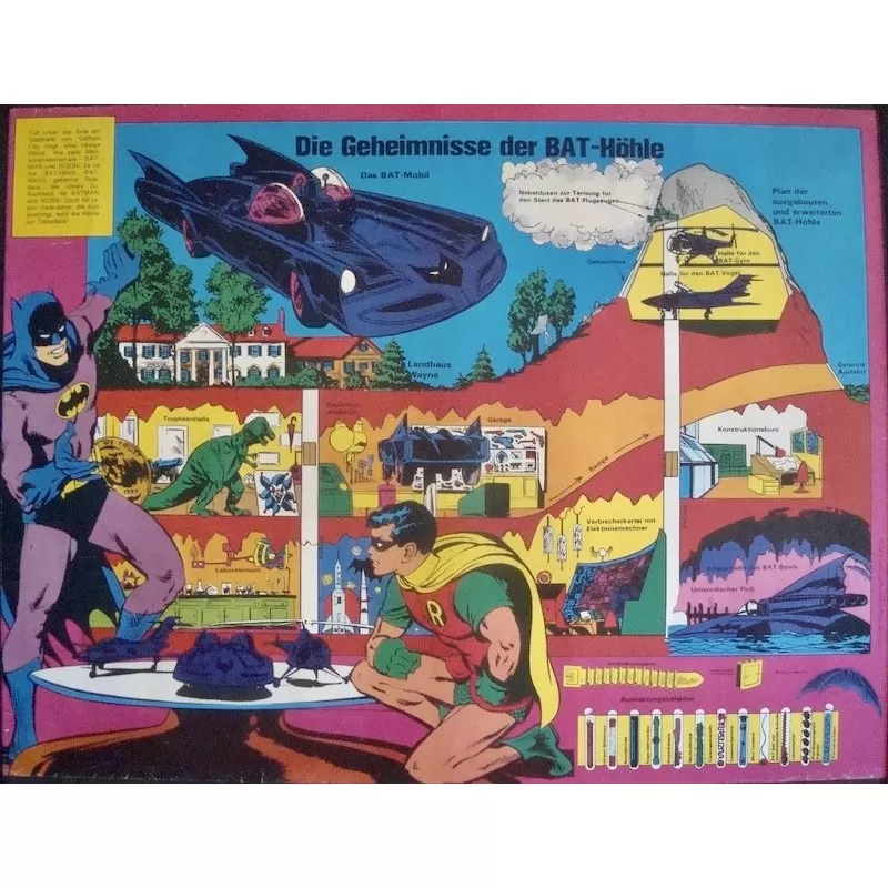 Very rare vintage 1969 German commercial poster featuring Batman and Robin and the layout of the batcave