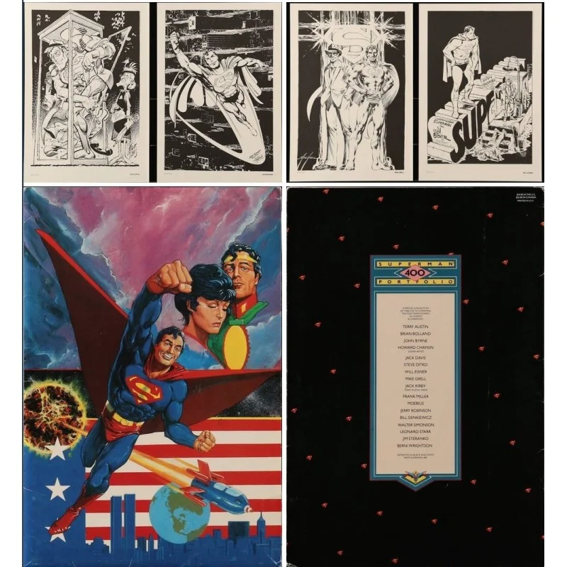 Rare complete portfolio of 17 different posters celebrating Superman 400 release in 1984. Art by Bernie Wrightson, Jack Davis, Steve Ditko, John Byrne, Jim Steranko, Will Eisner, Frank Miller...